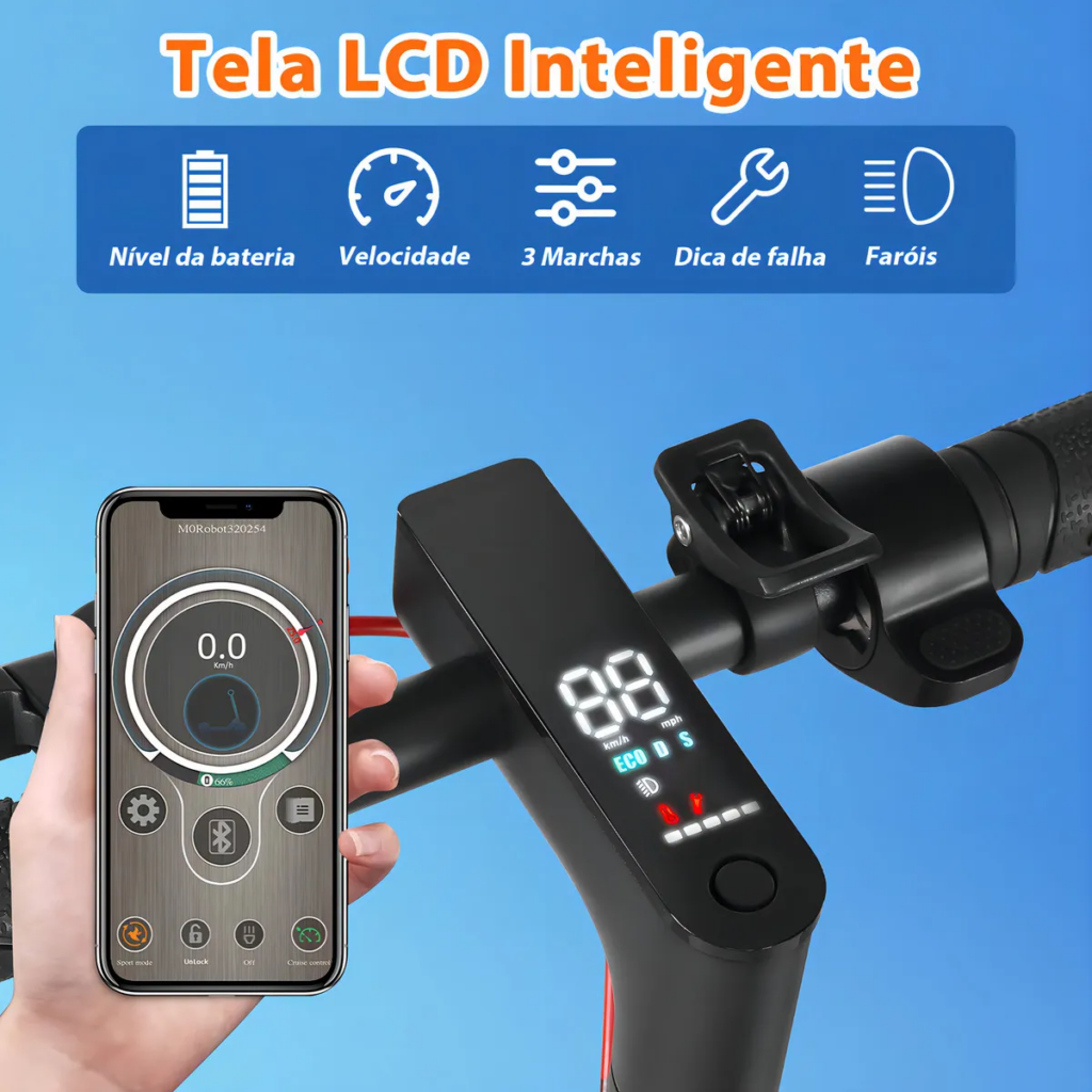 A bateria de 36V e 7,8Ah oferece autonomia de 20 a 22 km, ideal para deslocamentos urbanos de curta e média distância. O grande diferencial está na conectividade Bluetooth via aplicativo, que permite bloqueio eletrônico do motor, ajuste dos 4 modos de velocidade e monitoramento em tempo real da telemetria – recursos normalmente encontrados apenas em modelos muito mais caros [[30]][[32]].